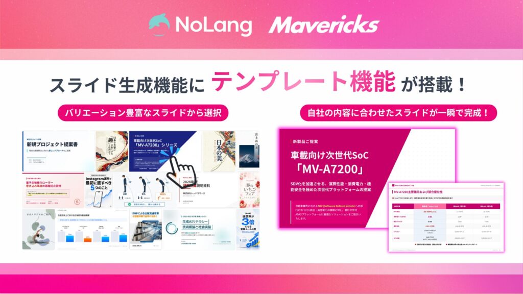 エンジニアや開発者のみなさん、資料作りに時間を取られすぎていませんか?そんな悩みを一気に解決してくれる最新AIニュースが飛び込んできました!日本発の動画生成AI「NoLang(ノーラン)」を提供する株式会社Mavericks(東京都文京区)が、スライド生成機能の大幅アップデートを発表しました。テンプレートを選ぶだけで、誰でも高品質なスライドがサクッと完成する「テンプレート機能」が4月末に公開予定です。